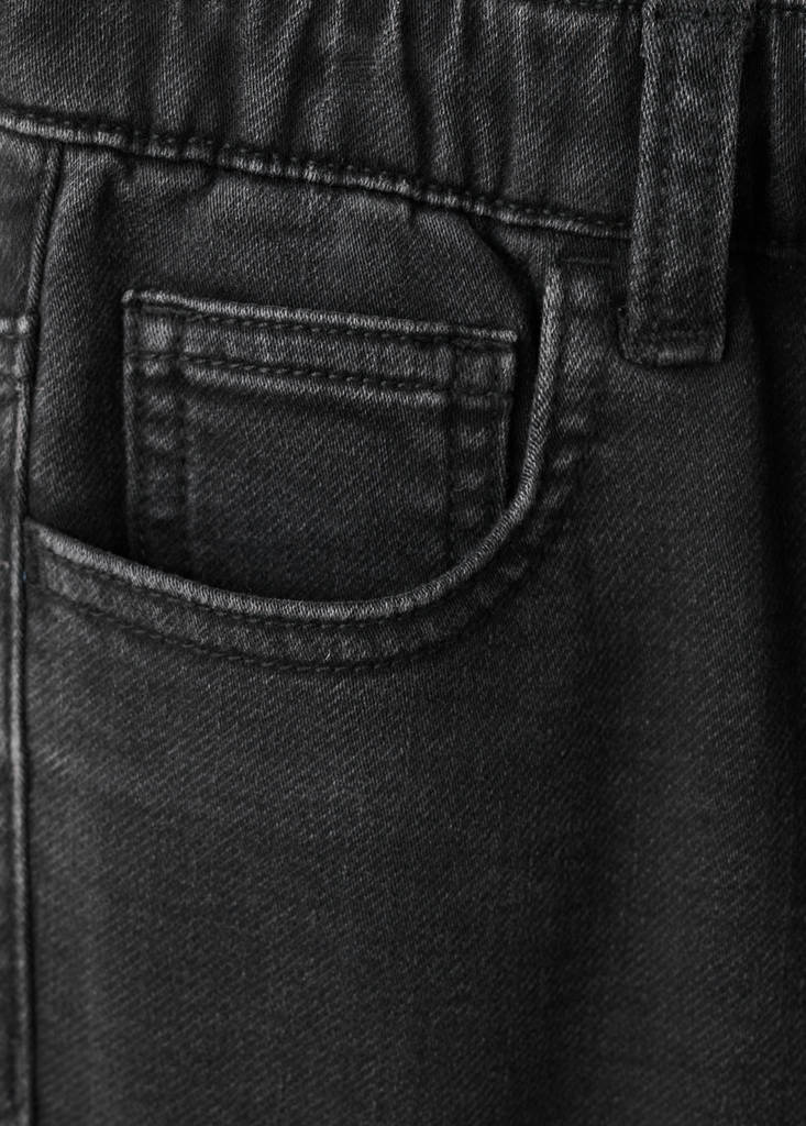Denim fabric. Cotton fabric. Stretch fabric. Long design. Elastic waist with drawstring. Two side pockets. Two patch pockets at the back. Due to the washing process, the shade of the denim may show slight variations compared to the image displayed