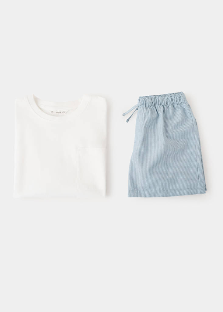 Pack of short-sleeved t-shirt and short pyjama trousers. 100% cotton fabric. Short sleeves. Knitted top with zip. Striped shorts. Elastic waist with drawstring