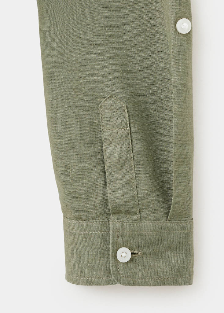 Linen and cotton blend fabric. Straight design. Shirt collar. Long sleeves with buttoned cuffs. Front closure with buttons