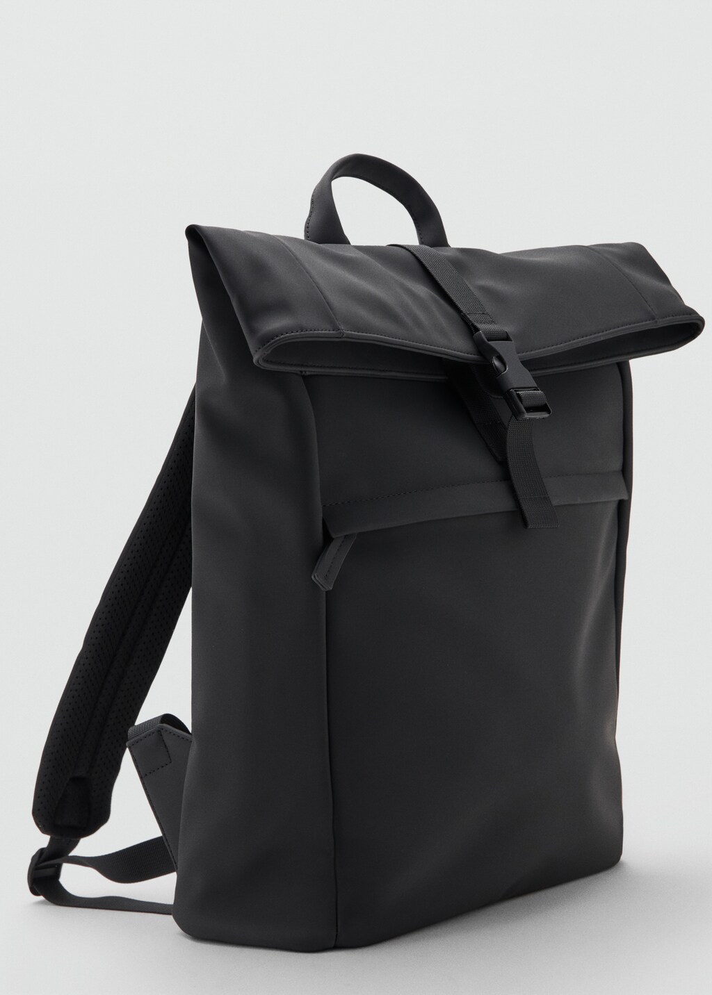 Gummed fabric. Two adjustable handles. Internal pocket for electronic devices up to 25 cm wide. Band handle for easy transport as a carry-on bag. Flap closure with carabiner clasp and adjustable strap. Multiple pockets.