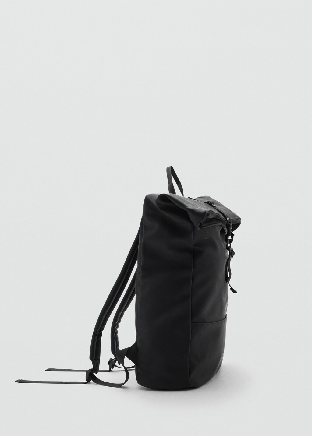 Gummed fabric. Two handles. Internal pocket for electronic devices up to 25 cm wide. Band handle for easy transport as a carry-on bag. Zipped main compartment. Flap closure with carabiner clasp and adjustable strap.