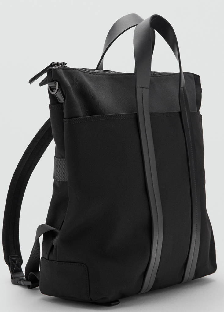 Leather details. Main compartment with zip closure. Two short hand grips. Long adjustable shoulder strap with detachable option. Two adjustable handles. Compartment for electronic devices