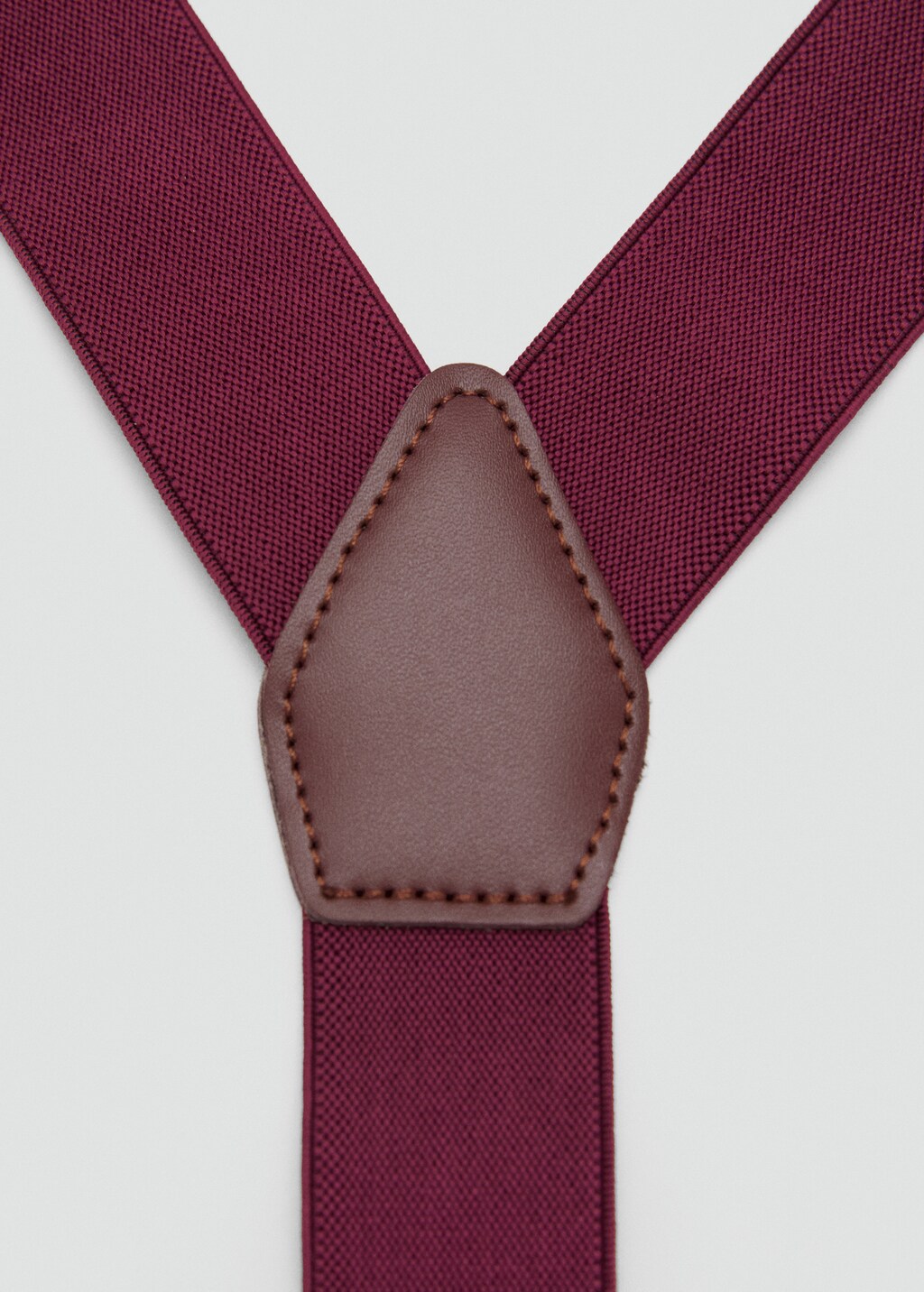 Adjustable elastic straps. Leather details. Metal clip hooks and button sticks.