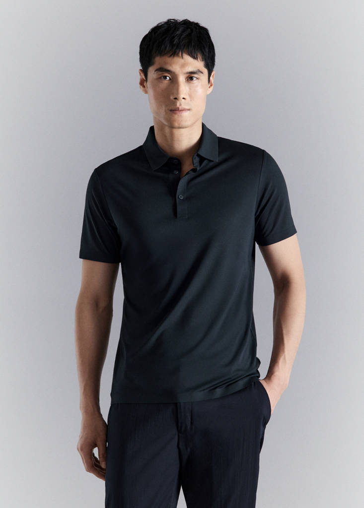 Performance Collection. Thermoregulating: This fabric offers optimal breathability to keep you at a stable temperature. Comfort Stretch: Stretch fabric for added comfort. Slim fit. Polo-neck with button closure. Thermo-sealed short sleeves. Hem with two side slits