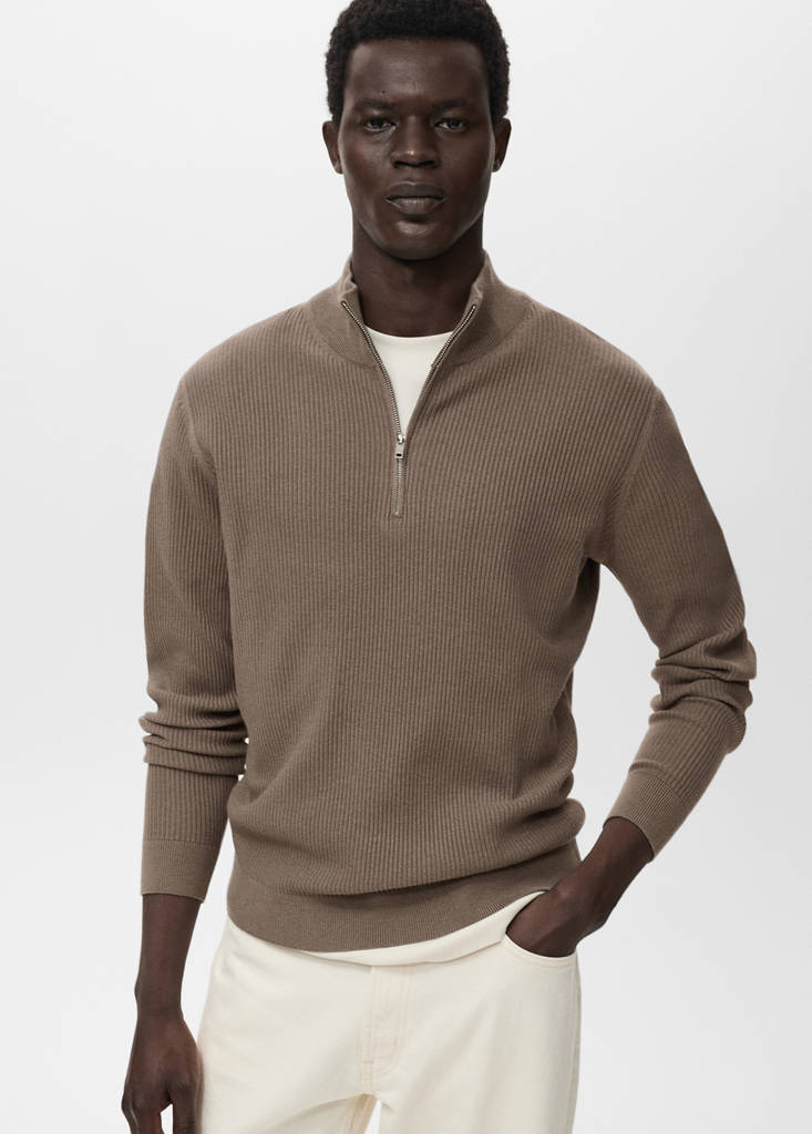 Regular fit. The dark grey model is an online exclusive. The mink grey model is an online exclusive. Cotton blend fabric. Ribbed knit. Perkins collar with zip closure. Ribbed finish on neck, sleeves and hem