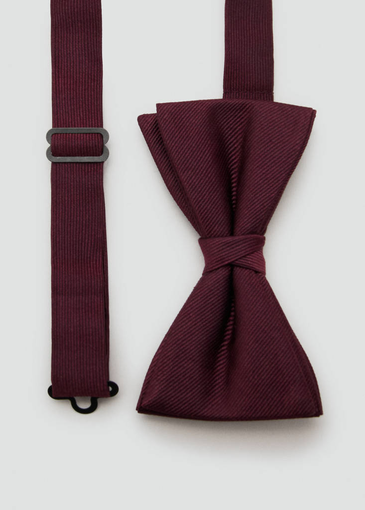 New NowClassic bow tie with microstructureCurrent price [$ 79.95 ]$ 79.95Select a colourBurgundySelect your sizeOne sizeAddAdd to your wishlistSee lookFree delivery to storeStructured fabric. 3 cm wide. Metallic clip fastening11.0x8.0 cmDetails, composition and careStore availabilityItem qualitiesSilkAt least 60%As one of the world's most valuable natural fibres, silk gives a lustrous finish and soft feel to garments.