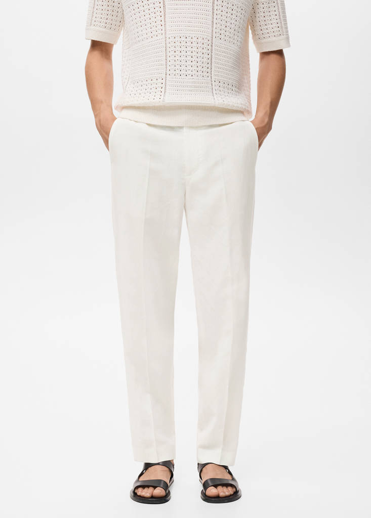 Linen and lyocell blend fabric. Regular fit. Belt loops. Side pockets. Two back pockets with buttons. Pressed crease detail at the front and back. Front fastening with double-breasted buttons and zip