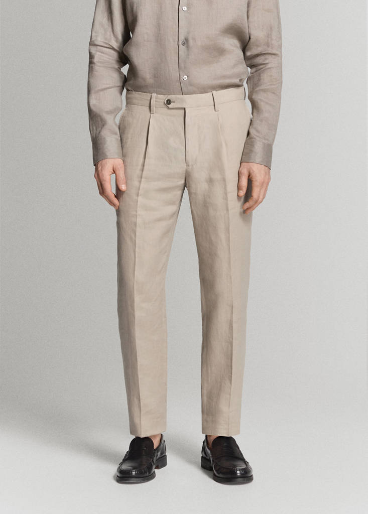 ESSENTIALS: Made to last. Slim fit. Standard Length. 100% Linen. Belt loops. Front zip, hook and double button closure. Two side pockets. Coin pocket. Two welt pockets with button at the back. Pressed crease detail at the front and back
