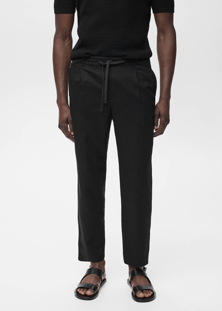 Cotton and linen blend fabric. Slim Silhouette. Elastic waist with adjustable drawstring. Lanyard with option of visible or hidden knot on the inside. Belt loops. Front fastening with double-breasted buttons and zip. Darts on the front. Two front pockets. Two welt pockets with button at the back. Linen mix. Slim fit