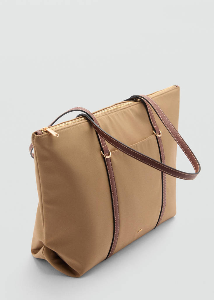 Large. Nylon fabric. Shopper style. Double handle. Shoulder strap. Zip closure. Contrasting coloured straps. Inner lining. Double handle. Outer pocket. Contrast strap. Zip fastening. Inner lining