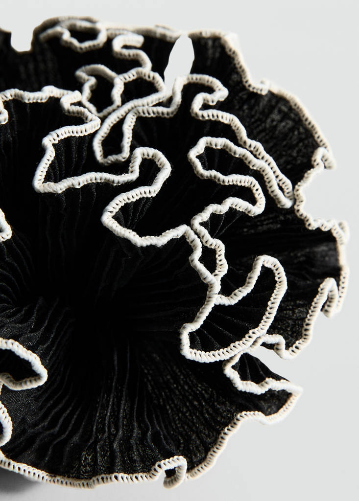 Flower scrunchie with contrasting trimCurrent price [$ 25.95 ]$ 25.95Select a colourBlackSelect your sizeOne sizeAddAdd to your wishlistSee lookFree delivery to storeFloral design. Textured. Contrast trimDetails, composition and careStore availability
