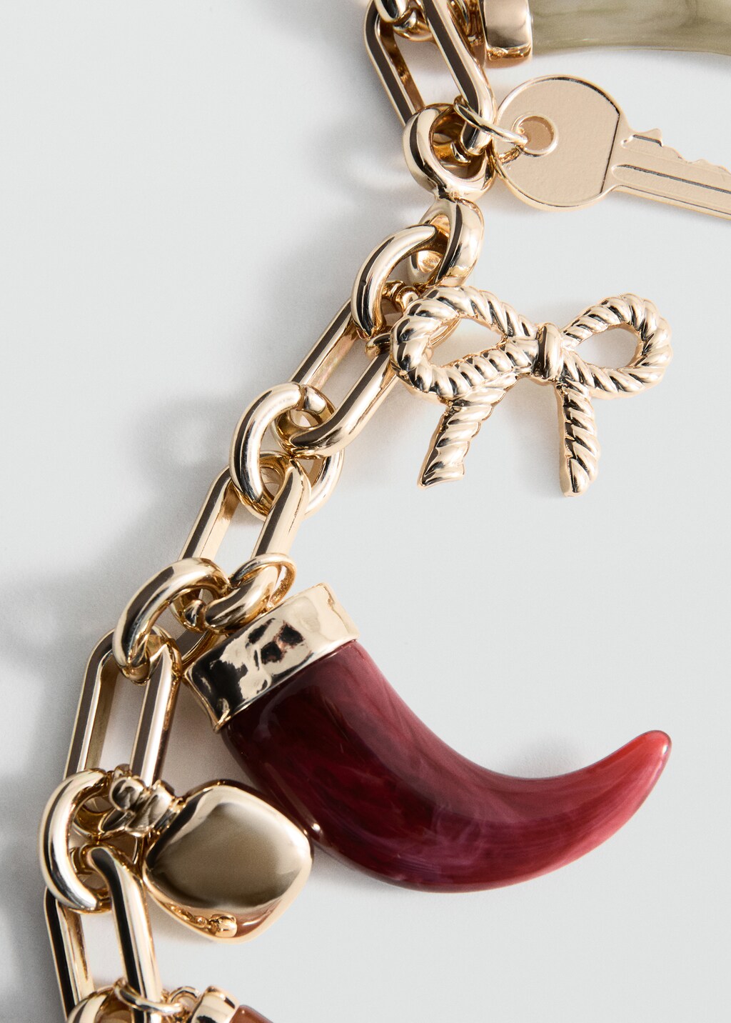 Chain design. Charm detail. Hook fastening.
