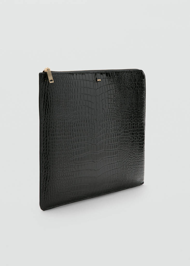 Crocodile skin. Debossed logo. Zip closure. Interior pocket. Inner lining. 13 inches