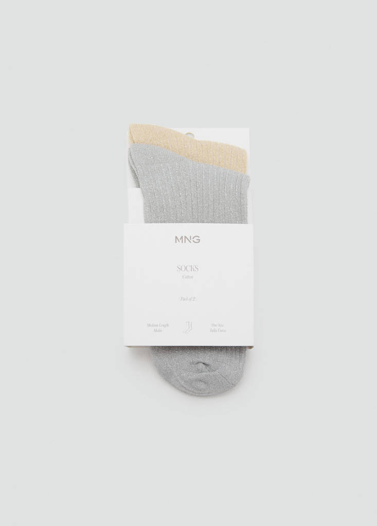Pack of 2 ribbed lurex socksCurrent price [$ 25.95 ]$ 25.95Select a colourGreySelect your sizeOne sizeAddAdd to your wishlistSee lookFree delivery to storePack of 2. Lurex fabric. Ribbed designDetails, composition and careStore availabilityItem qualitiesRecycled cottonAt least 20%This fibre is obtained from pre- and post-consumer textile waste that is transformed into new fabrics.