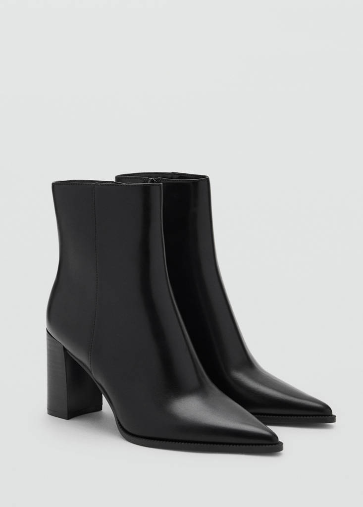 Ankle boots with block heelInitial price struck through [$ 109.95 ]$ 109.95Current price [$ 79.95 ]$ 79.95-27%Select a colourBlackSelect your size35Not available. I want it!36Not available. I want it!37Not available. I want it!38Not available. I want it!39Not available. I want it!40Not available. I want it!41Not available. I want it!42DimensionsAddAdd to your wishlistSee lookFree delivery to storePointed. Block heel. Side zip closure. Inner lining. Faux leather. 8.5 cm heelDetails, composition and careStore availability