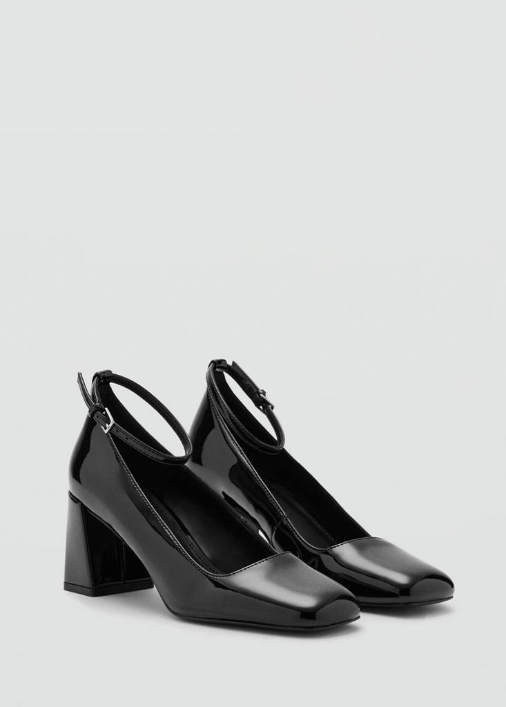 Patent leather effect. Square-toe. Block heel. Ankle bracelet. Buckle closure. 7.5 cm heel