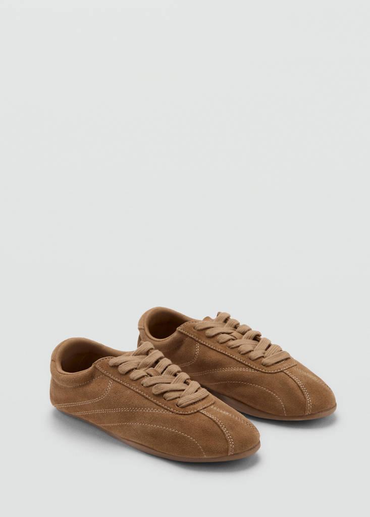 Bovine hide. Round toe. Contrasting panel. Laces. Flat