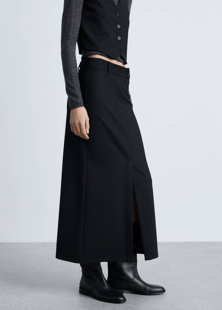 Straight design. Long design. Pinstripe pattern. Mid-rise. Belt loops. Front opening. Side zip closure. Inner lining