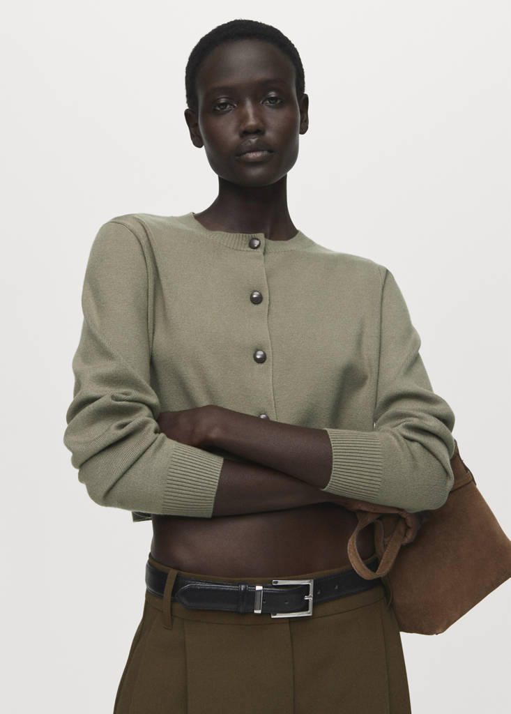 Crafted from fine-knit fabric, this straight design features a round neckline and long sleeves. The front button closure adds functionality. It comes with a matching top