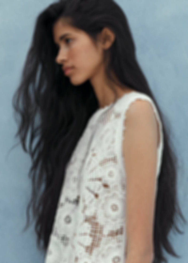 video.play.labelvideo.pause.labelNew NowEmbroidered top with openwork detailsCurrent price [$ 79.95 ]$ 79.95Select a colourOff WhiteSelect your sizeXXSXSSMLXLXXLMeasurementsAddAdd to your wishlistSee lookFree delivery to storeOpenwork fabric. Straight design. Round neck. Straps. Sleeveless. Cut-out embroidered details. Teardrop fastening at backDetails, composition and careStore availability