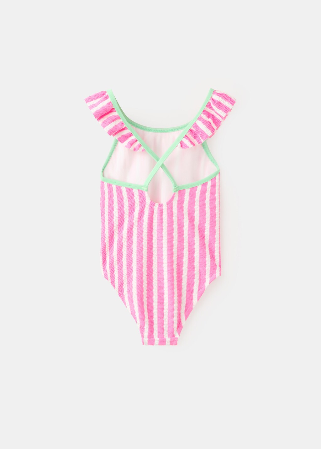 Stretch fabric. Ruched fabric. Stripe design. Ruffled neckline. Crossover back. Coloured contrasting trims. Swimwear collection.