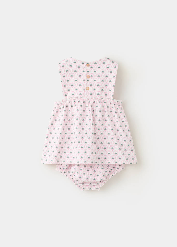 Cotton fabric. Straight design. Short design. Floral-print design. Straight collar. Straps. Frog with elastic ends