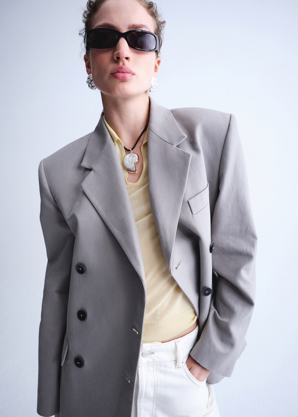 Linen and cotton blend fabric. Straight design. Lapel-collar V-neck collar. Lapel with notch. Long sleeves with buttoned cuffs. Chest welt pocket. Two side pockets with flaps. Triple button fastening. Inner lining. Selection Collection.