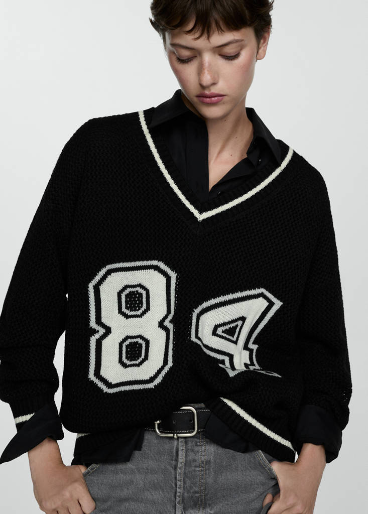 Chunky knit fabric. Oversized design. Long design. V-neck. Long sleeves. Contrasting message. Contrast piping detail