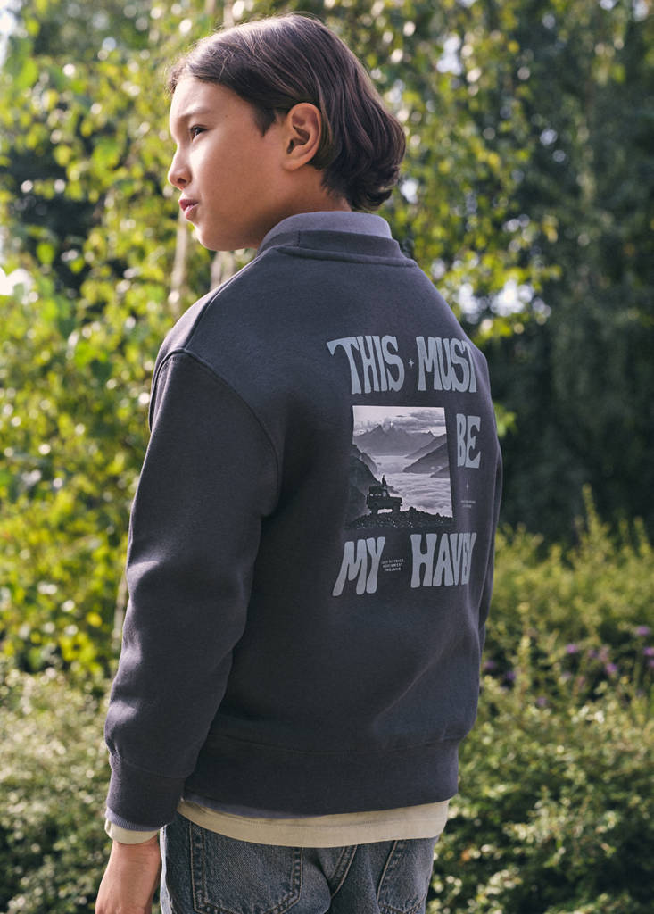 Crafted from 100% cotton fabric, this garment features a straight design with a print. It includes a round neck and long sleeves. It stands out for its decorative patch and a front patch pocket, as well as the printed design on the back