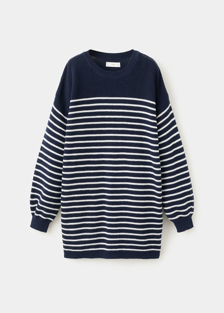 100% cotton fabric. Knitted fabric. Striped fabric. Midi design. Straight design. Round neck. Long sleeves. Ribbed collar, cuffs and hem. Valentine Collection.