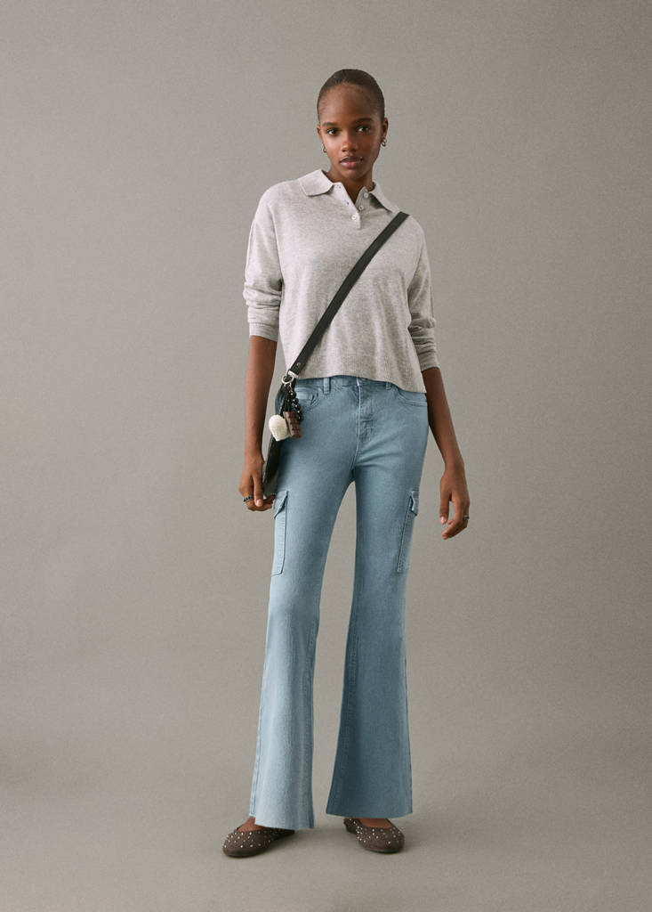 Denim-style cotton fabric. Crop design. Flare design. Two cargo pockets. Three front pockets. Two patch pockets at the front. Belt loops. Frayed hem. Zip and button fastening