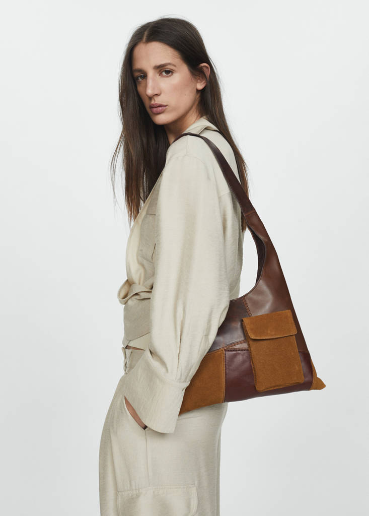 100% bovine leather. Patchwork pattern. Long strap. Pocket with flap. Magnetic metallic fastening. Inner zipped pocket