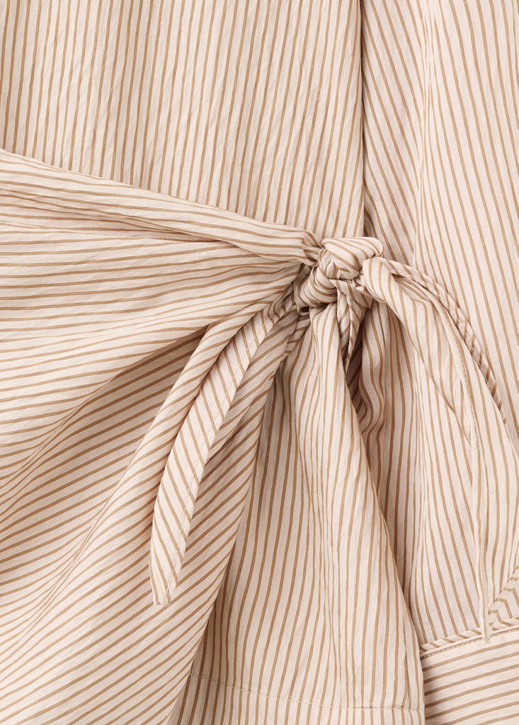 Lyocell fabric. Long design. Striped print. Round neck. Knot detail at the waist. Long buttoned sleeves. No Fastening.