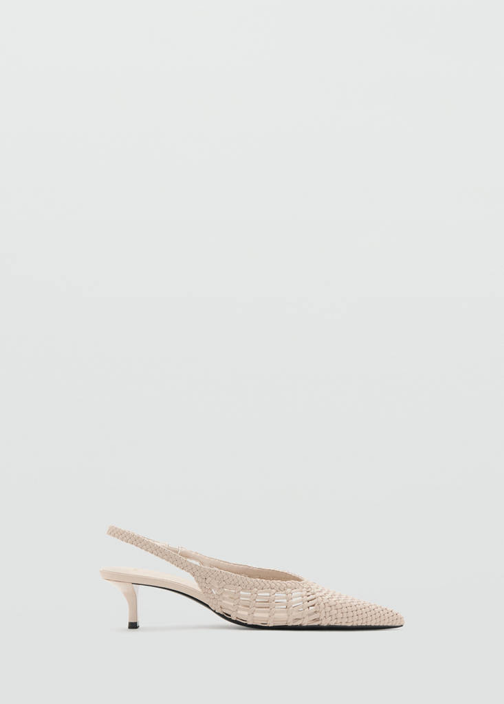 Braided design. Pointed. Slingback design. Kitten heel. 5 cm heel. Strap closure