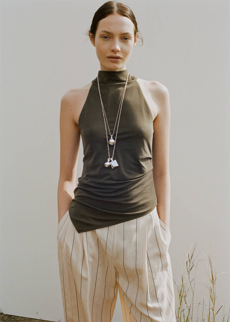 Asymmetric design. Halter neck. Draped neckline. Sleeveless. Gathered detail. Metal hook closure on the neck. Total look