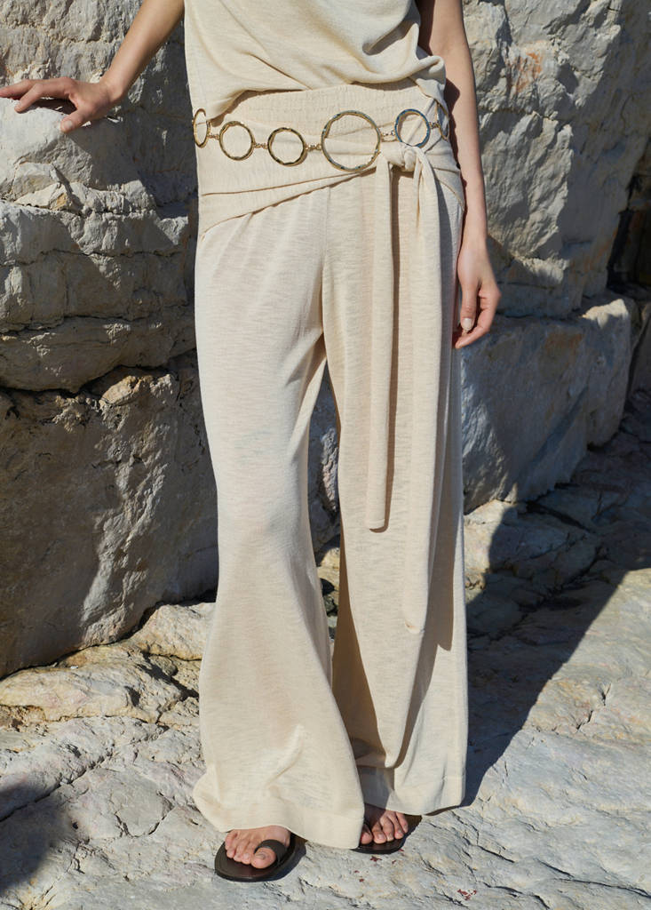 Fine knit fabric. Palazzo design. Long design. Elasticated waist. Knot detail at the waist. Available Plus