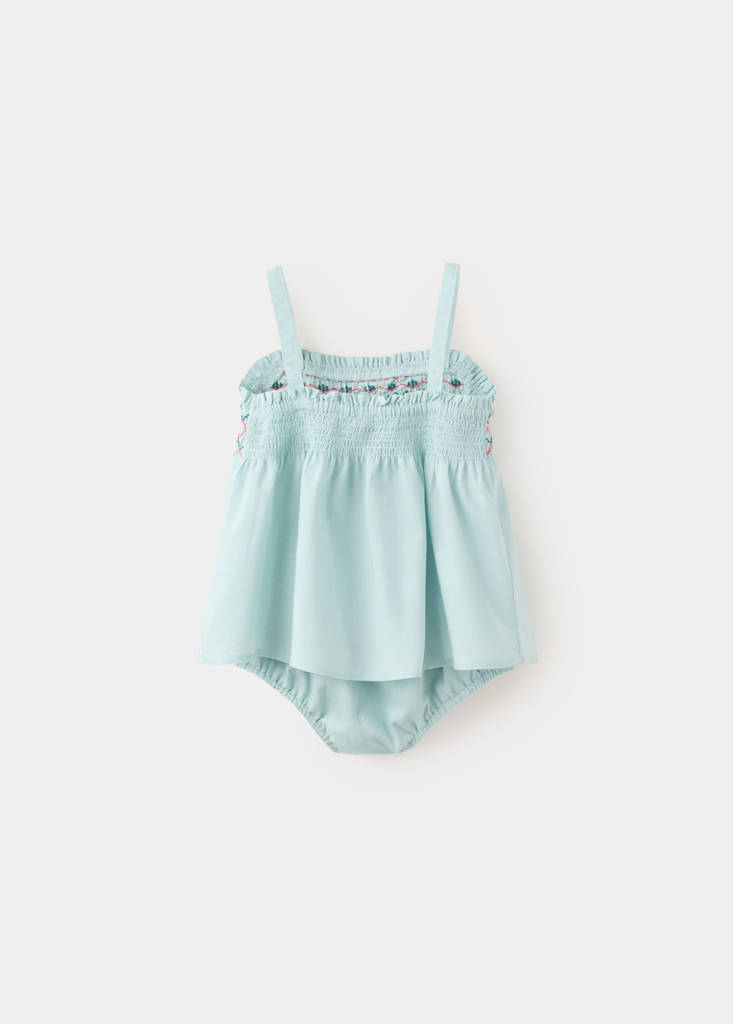 Ткань 100% хлопок. Прямой вырез. Тонкие бретели. Эластичная талия. Эластичные отделки. Контрастные вышитые детали. Цветочная вышивка