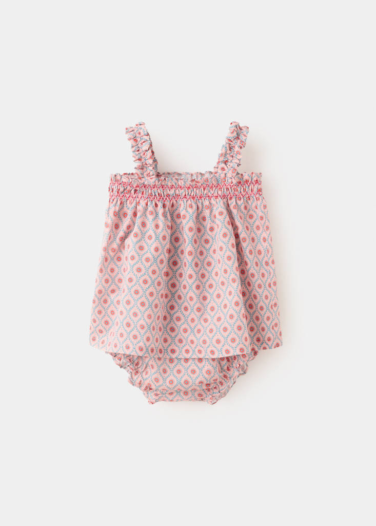Ткань 100% хлопок. Дизайн с принтом. Прямой вырез. Бретели. Эластичная талия. Эластичные отделки. Контрастные вышитые детали