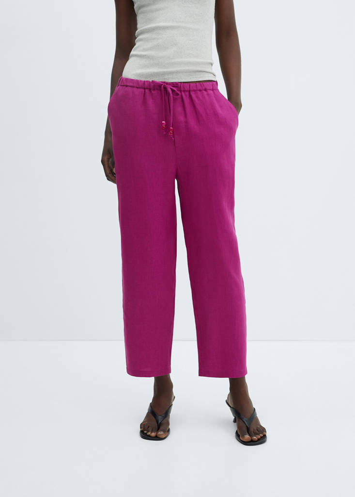 Льняная ткань. Текучая ткань. Кроп-дизайн. Фасон джоггеры. Средняя посадка. Эластичный пояс с завязками. Два боковых кармана. Два задних кармана с кантом. Подкладка