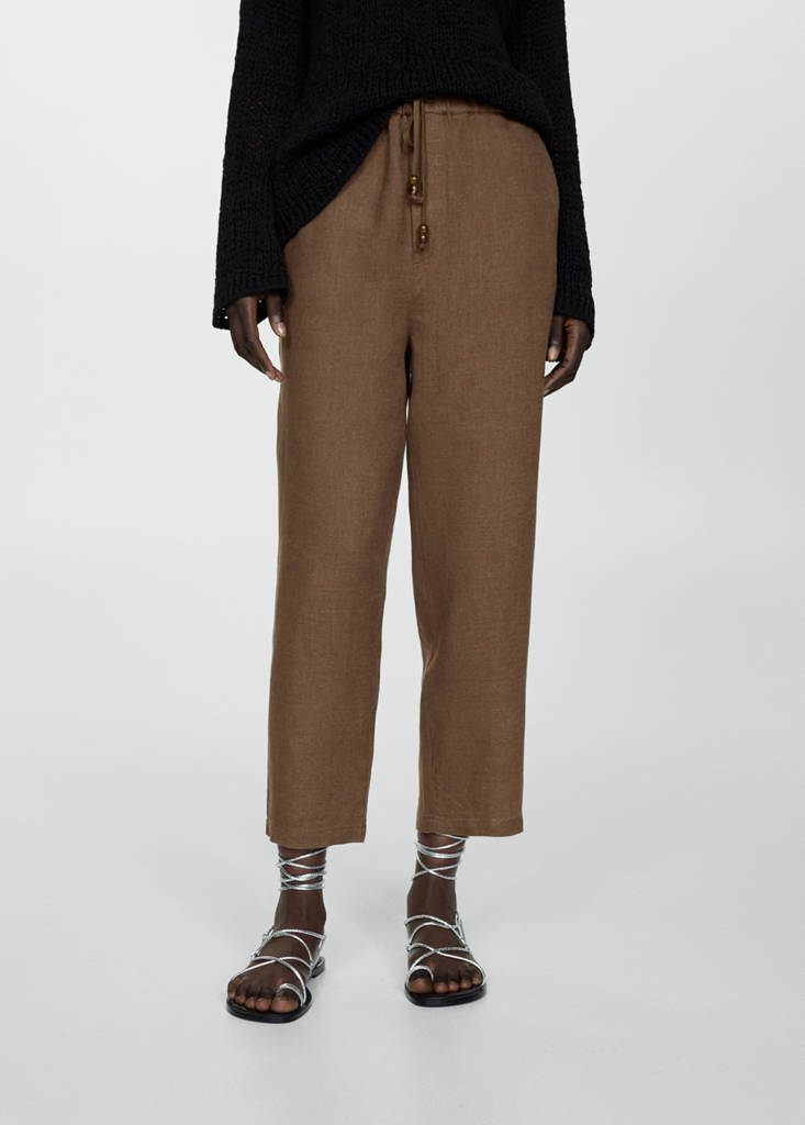 Льняная ткань. Текучая ткань. Кроп-дизайн. Фасон джоггеры. Средняя посадка. Эластичный пояс с завязками. Два боковых кармана. Два задних кармана с кантом. Подкладка