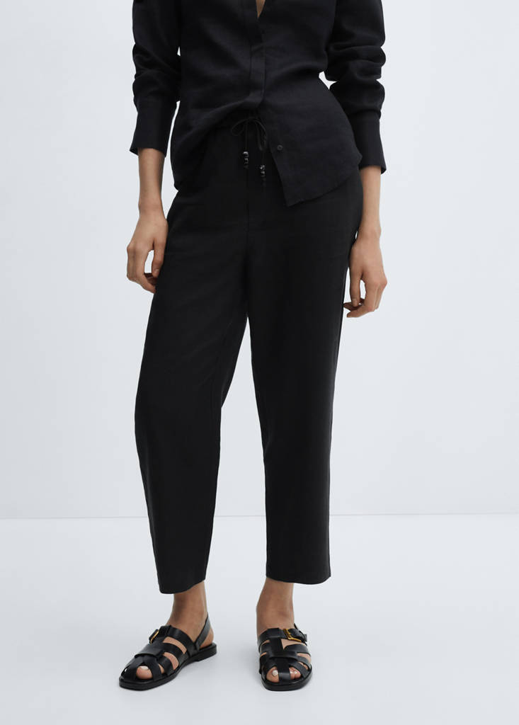 Льняная ткань. Текучая ткань. Кроп-дизайн. Фасон джоггеры. Средняя посадка. Эластичный пояс с завязками. Два боковых кармана. Два задних кармана с кантом. Подкладка