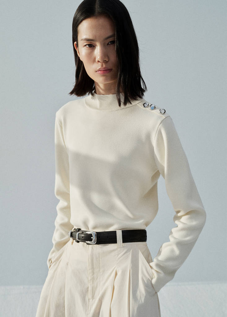 Тонкий трикотаж. Прямой крой. Воротник перкинс. Длинные рукава. На плече пуговицы. Без застежки