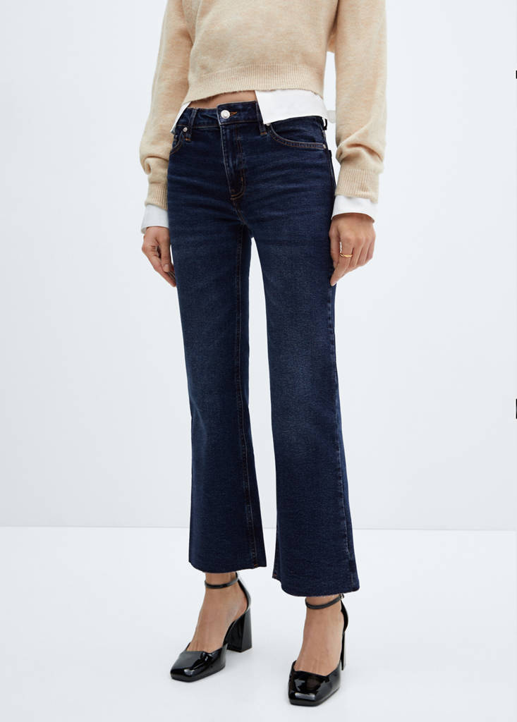 Хлопковая ткань в стиле джинсовой ткани. Эластичная ткань. Дизайн колокол. Стиль клёш. Кроп-дизайн. Высокая посадка. Шлёвки. Пять карманов. Застежка-молния и пуговица. Длина по внутреннему шву 68 см. Доступно Plus. В состав входит переработанный хлопок. Расклешенный фасон. Необработанная линия низа с торчащими нитками