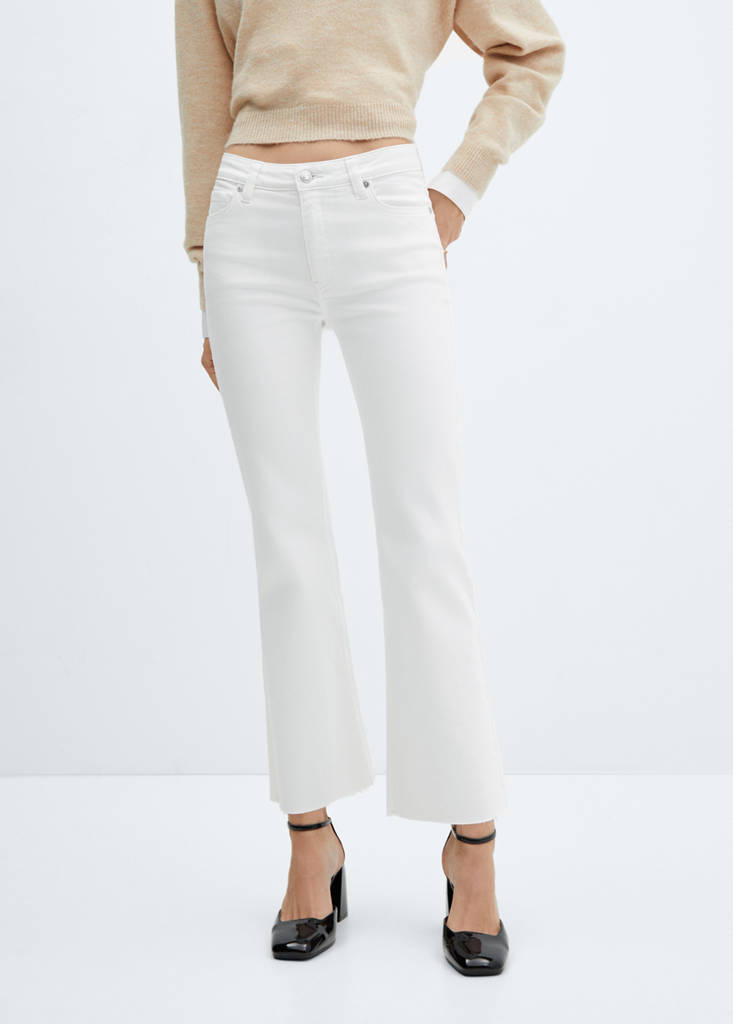 Хлопковая ткань в стиле джинсовой ткани. В состав входит переработанный хлопок. Эластичная ткань. Дизайн колокол. Стиль клёш. Кроп-дизайн. Высокая посадка. Шлёвки. Пять карманов. Застежка-молния и пуговица. Необработанная линия низа с торчащими нитками. Длина по внутреннему шву 68 см. Доступно Plus