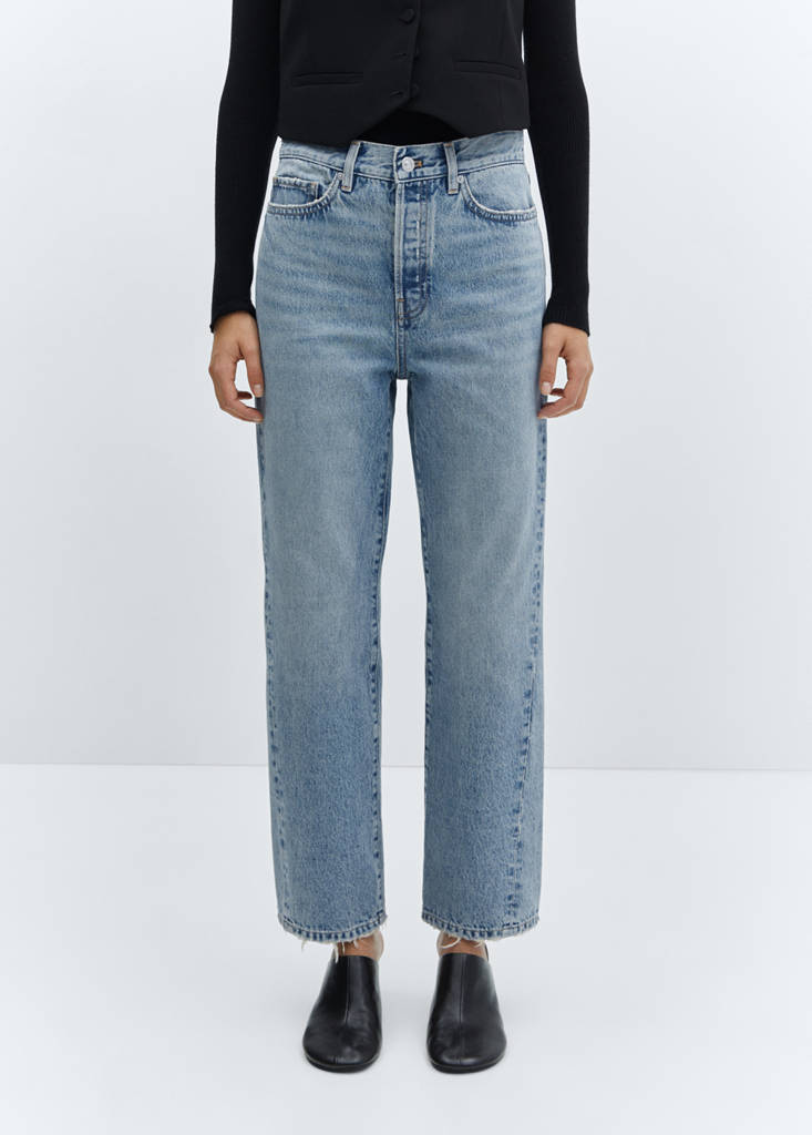 Хлопковая ткань в стиле джинсовой ткани. Прямой крой. Кроп-дизайн. Высокая посадка. Шлёвки. Пять карманов. Застежка на пуговицы. Боковые швы направлены по диагонали вперед. Длина по внутреннему шву 72,5 см.