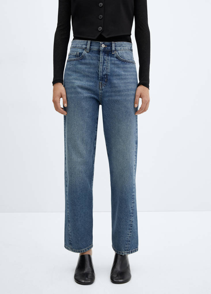 Хлопковая ткань в стиле джинсовой ткани. Прямой крой. Кроп-дизайн. Высокая посадка. Шлёвки. Пять карманов. Застежка на пуговицы. Боковые швы направлены по диагонали вперед. Доступно Plus. Длина по внутреннему шву 72,5 см.