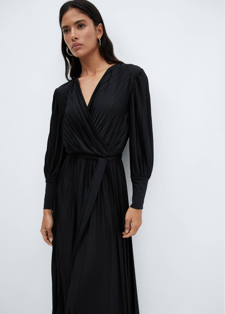 Текучая ткань. Миди-дизайн. Дизайн трапеция. Перекрещенный дизайн. Плиссированный дизайн. Перекрещенный V-образный вырез. Длинные рукава. Без застежки. Лента на талии с завязкой. Коллекция для праздников, церемоний и первого причастия