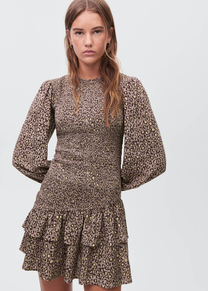 Текучая ткань. Ткань с анималистичным принтом. Дизайн трапеция. Леопардовый дизайн. V-образный вырез. Длинный рукав с эластичными и собранными манжетами. Застежка на пуговицу сзади. Лиф платья с эластичными сборками. Волан внизу