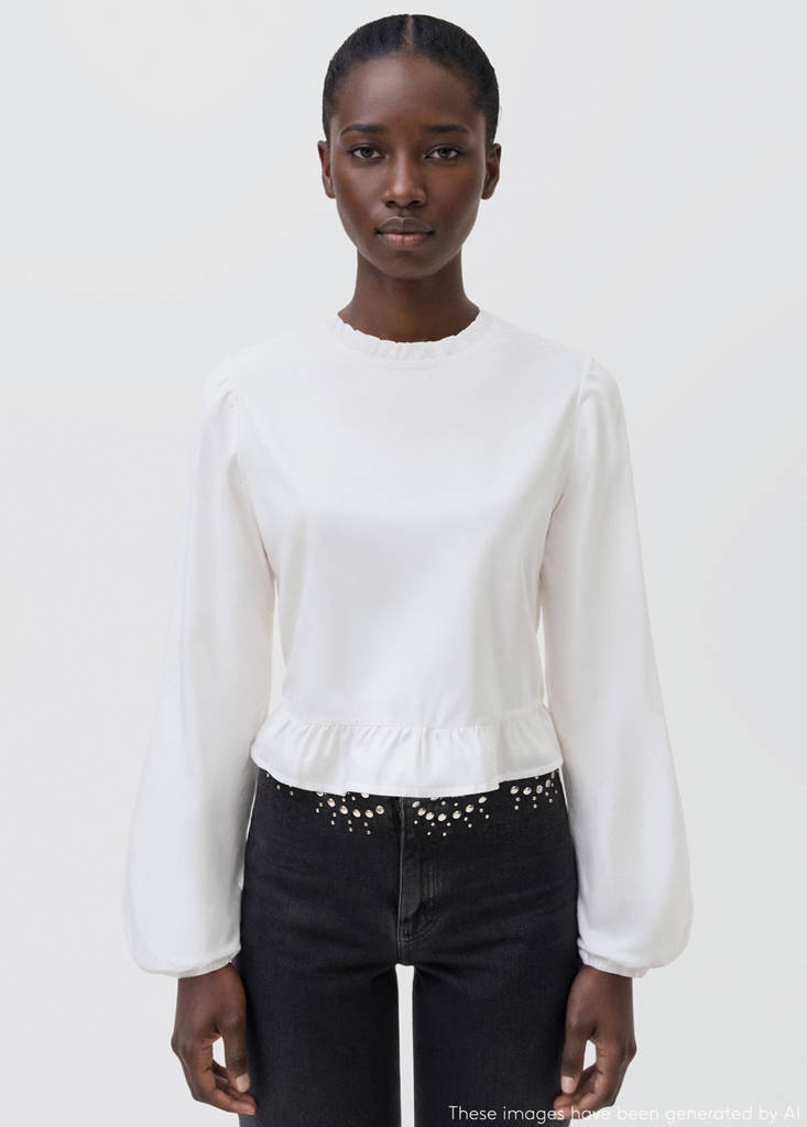 Модель А-силуэта, созданная из 100 % хлопка, имеет присборенный круглый вырез и объемные длинные рукава с манжетами и сборками. Волан по низу придает особенный штрих, а застежка на пуговицу сзади завершает дизайн