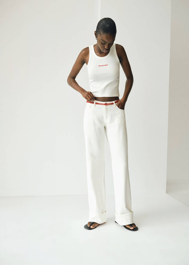 Хлопковая ткань. Эластичная ткань. Короткий дизайн. Прямой крой. Вышитый узор. Спереди вышивка. Вышивка текст. Круглый вырез. Бретели